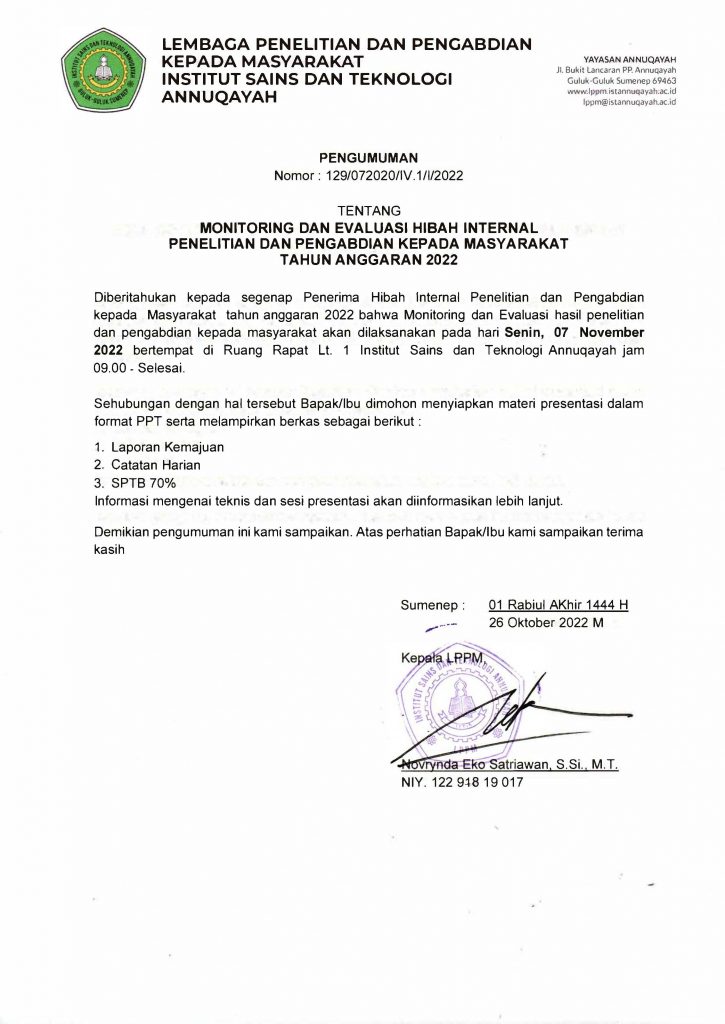 Bagi para penerima Dana Hibah Internal Tahun 2022, mohon untuk diperhatikan surat edaran berikut:
