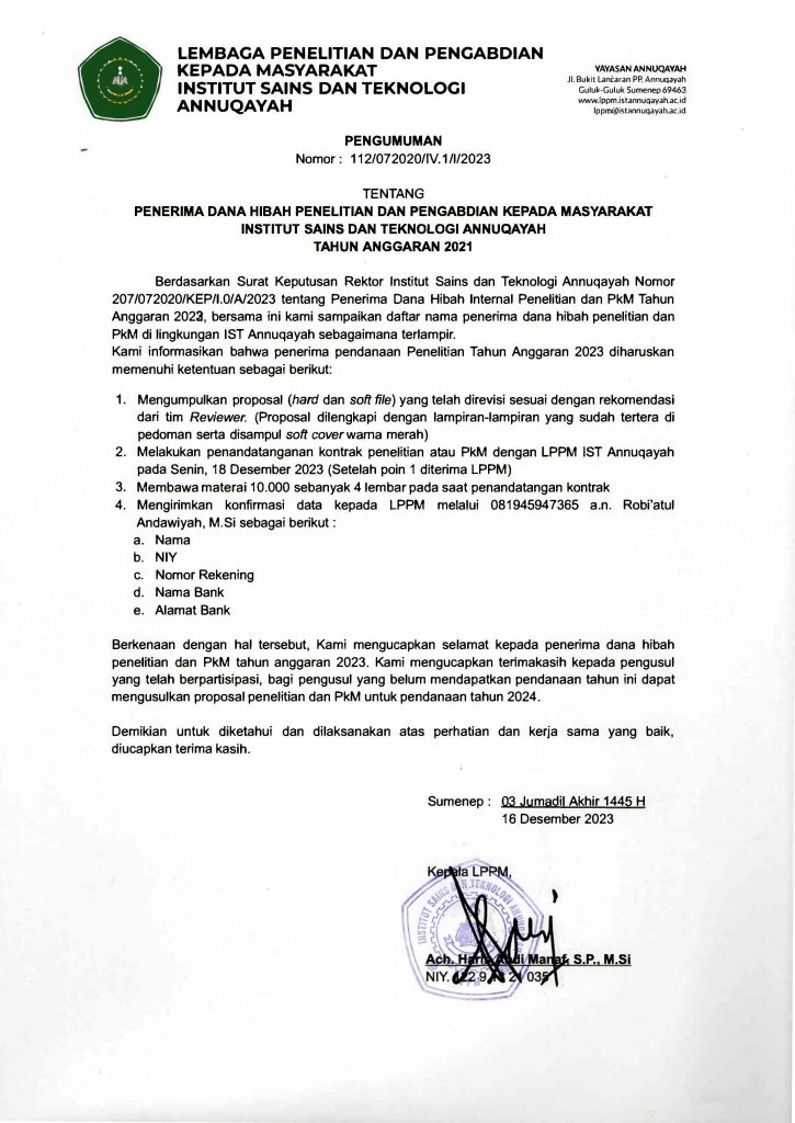 Menindaklanjuti Surat Keputusan Rektor Institut Sains dan Teknologi Annuqayah Nomor 207/072020/KEP/I.0/A/2023 tentang Penerima Dana Hibah Internal Penelitian dan PkM Tahun Anggaran 2023, berikut LPPM menginformasikan terkait penandatanganan kontrak penelitian hibah internal TA 2023.